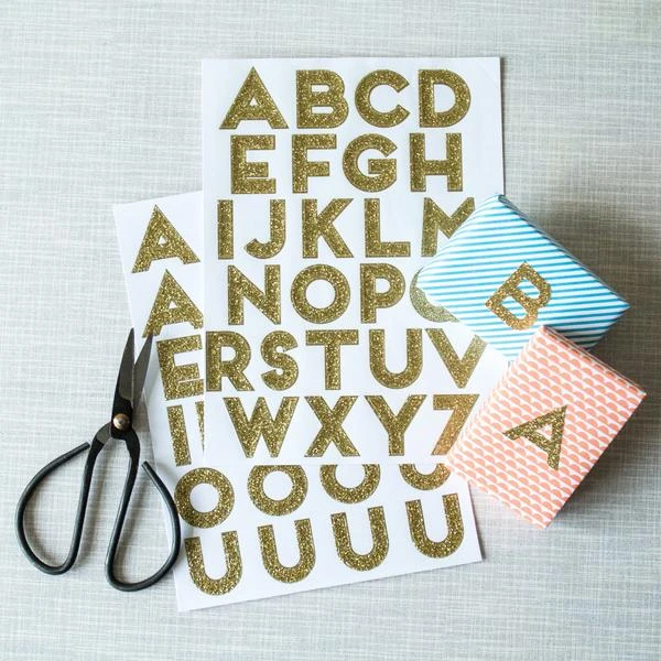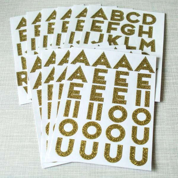 10 sheets of glorious gold glittery stickers Perfect for decorating wedding presents, baby showers, birthday presents, scrap booking, sticking to the fridge… Customise your parcels by applying alphabet stickers to form a message or the recipients name and your present will really stand out! The set includes 10 stickers sheets, the alphabet pack has six full alphabet sheets and four extra vowel sheets. made from: Paper, Glitter dimensions: H19.2 x W14 x D0.7cm