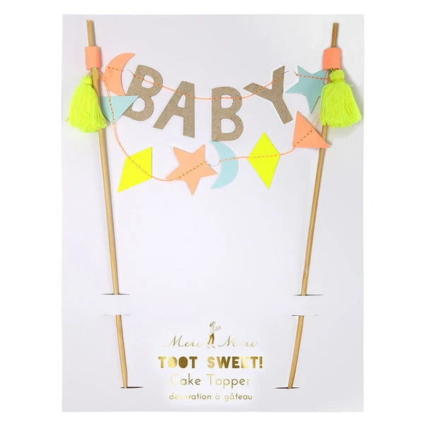 Celebrate a new arrival with a cake and this colourful cake topper decorated with neon coloured shapes and with bright neon tassels and thread. Pack contains 1 cake topper. Pack size: 7 x 9 inches.