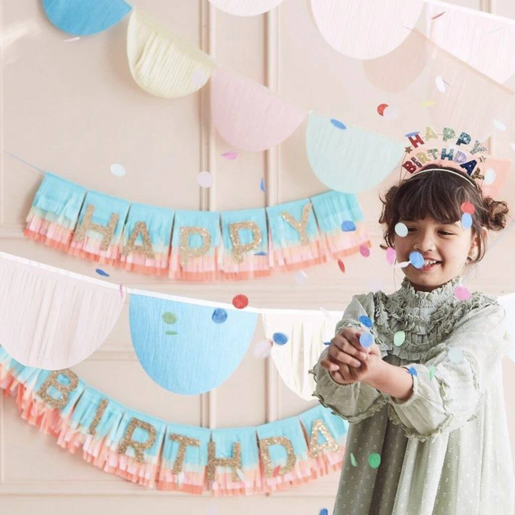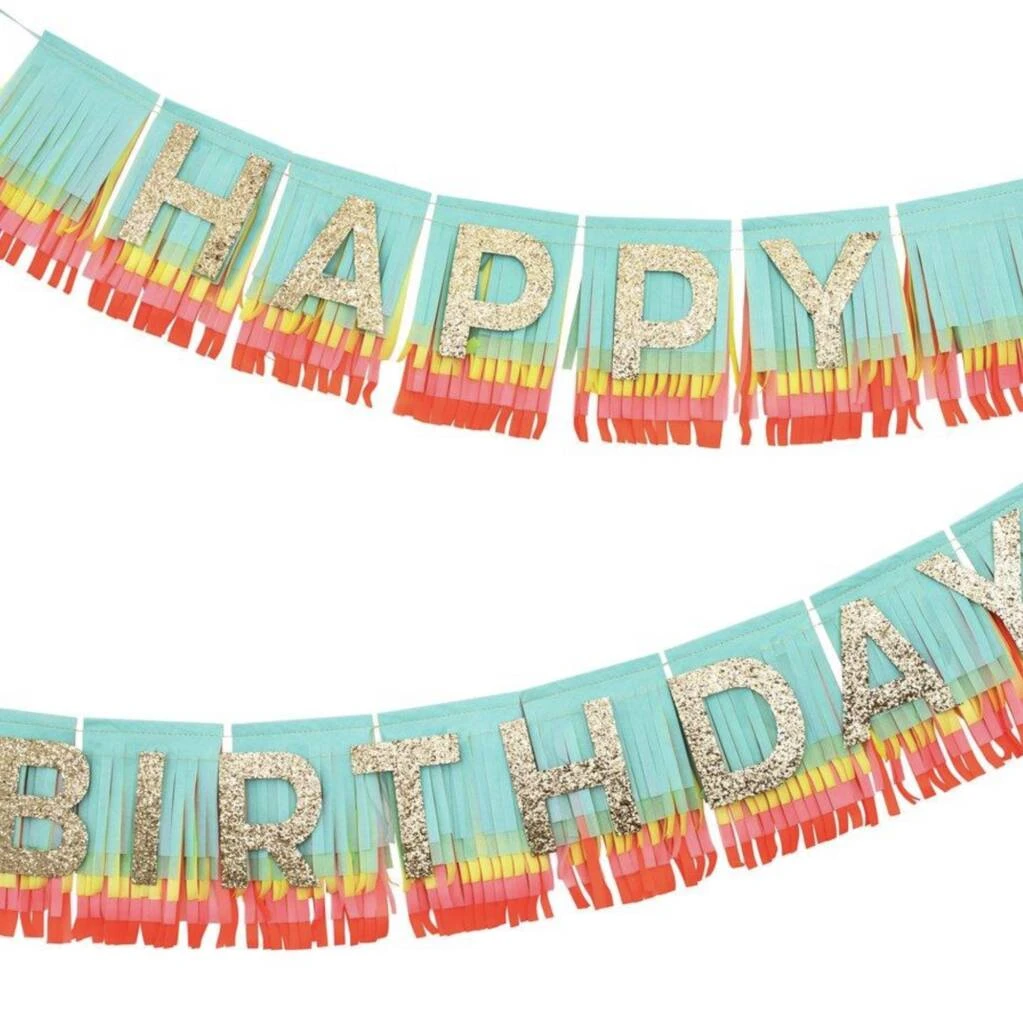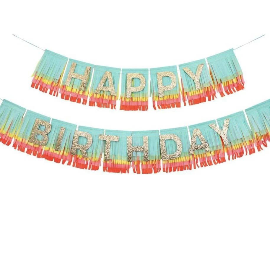 This gorgeous garland is the perfect decoration to celebrate a Happy Birthday. It’s beautifully crafted from fringed tissue paper, with eco-friendly glitter letters.