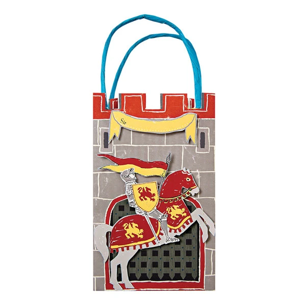 A party bag for a brave sir knight with a stylish turret and a knight in shining armour mounted on his fiery steed. The bag is finished with a blue twine handle. Package contains 8 party bags. Party bag size: 8 x 5 x 3 inches. New Part Number: 109162