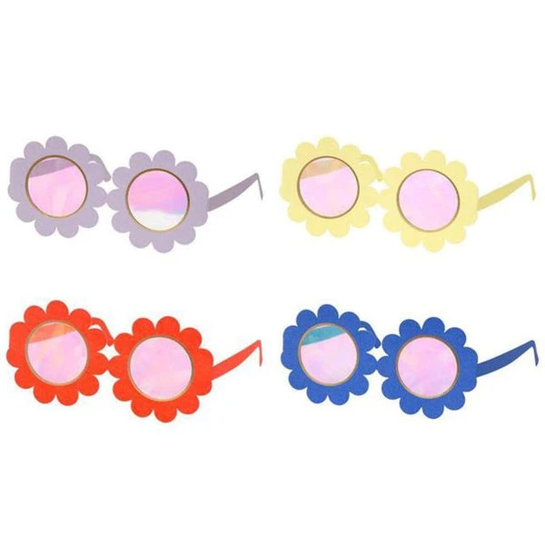 Die Brille ist aus brillanten, irisierenden Gläsern gefertigt. Das Set enthält insgesamt 12 Gläser in vier verschiedenen Farben: blau, gelb, weiß und flieder. Stelle die Gläser am Photobooth auf oder verteile sie an die Gäste beim Betreten der 60er Party. Lass uns tanzen!