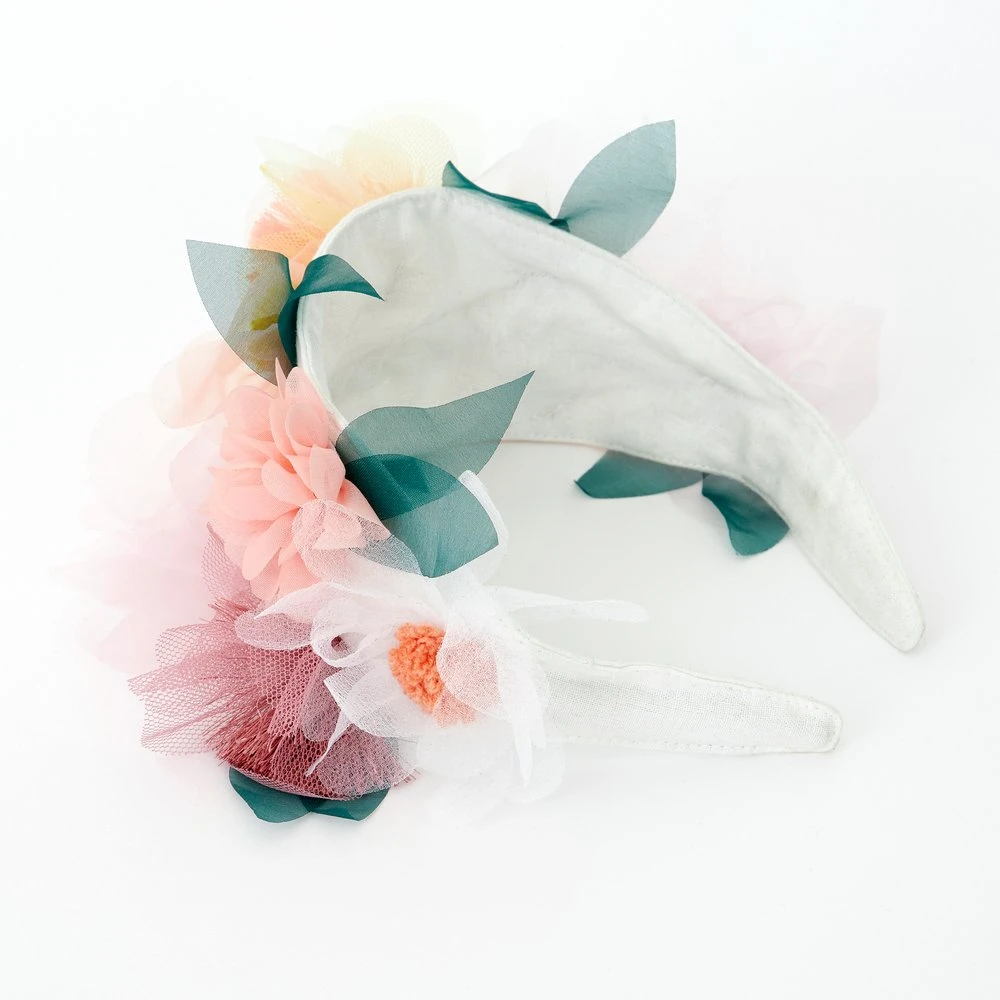 Cerchietto Fiori Kids who love colorful headwear will absolutely adore this sensational headband. It’s expertly crafted with organza and tulle flowers, organza leaves, and delightful tassels and pompoms. Perfect to wear to a party, or any special event where you want a touch of floral beauty. Dettagli: materiale: organza e tulle età consigliata: 3+ anni dimensioni: 165 x 165 x 114mm