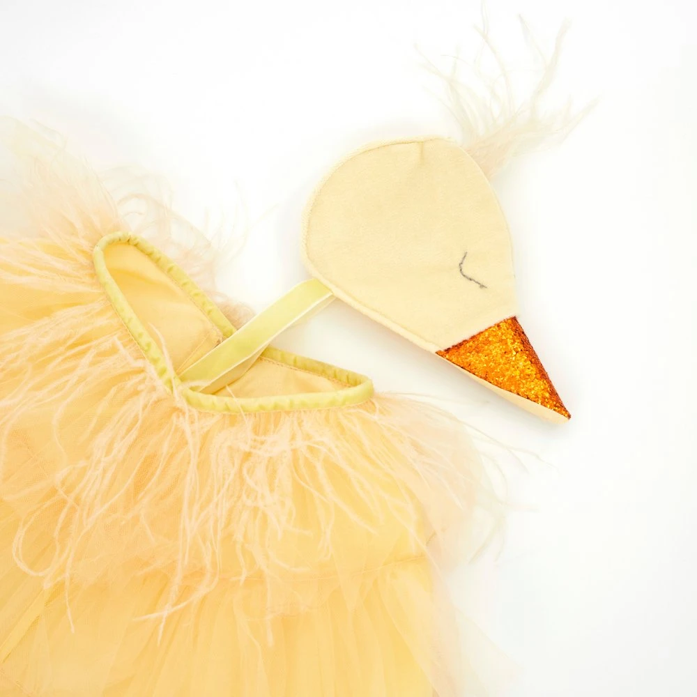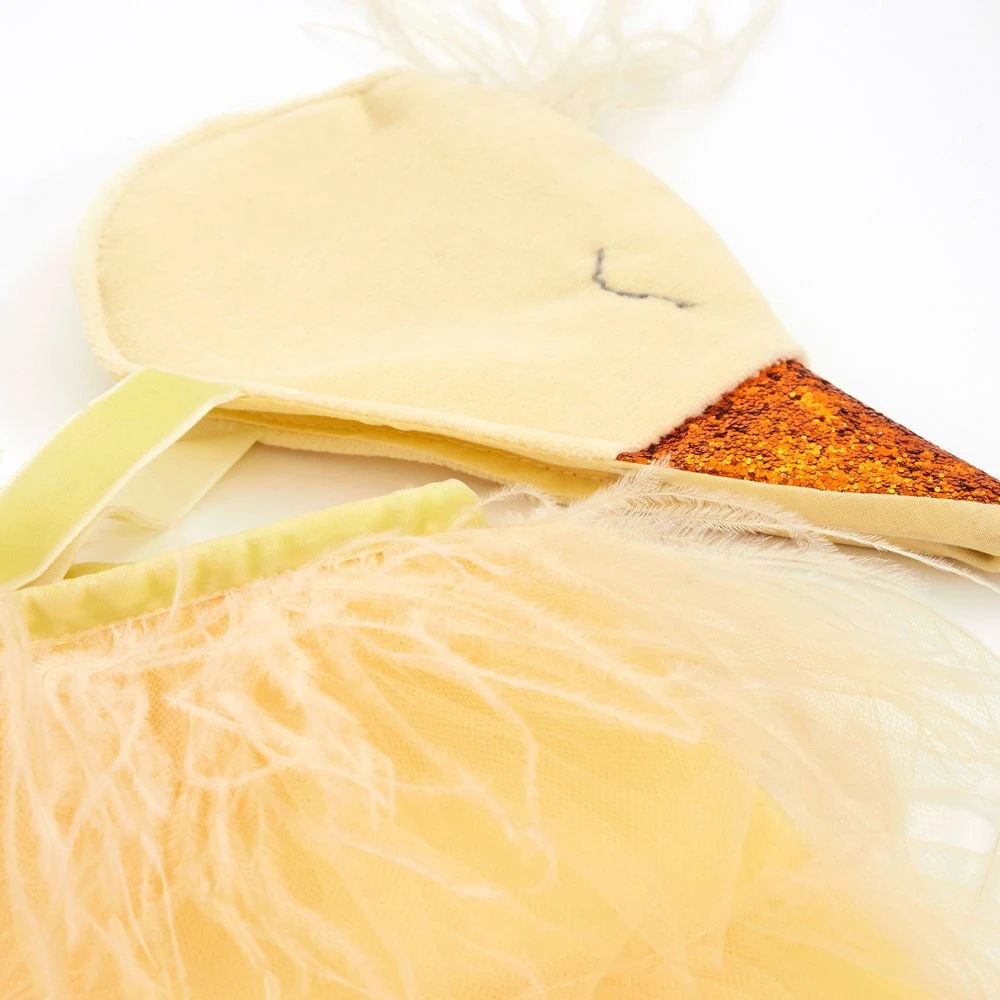 Transform your child into an adorable chick with this charming costume. It’s perfect to wear to an Easter celebration, a springtime party or imaginative fun anytime. It features a layered tulle cape and an embellished headpiece. The cape is crafted from layers of yellow tulle with yellow feathers The headpiece has a copper glitter fabric beak, stitched eye detail, a yellow velvet elastic strap, and an adorable tuft of yellow feathers Suitable for ages 3-6 years Product dimensions:Neck – 457mm, Length – 406mm