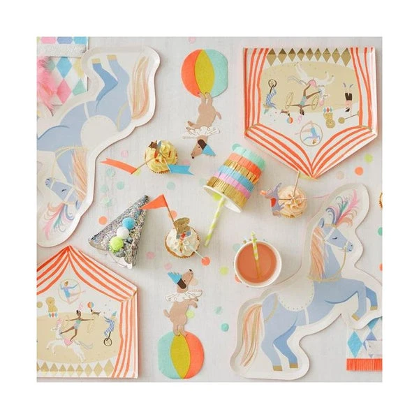 These colorful Circus Parade plates are beautifully illustrated with circus characters. Perfect for a circus-themed party, or any party where you want charming tableware. Die cut Printed both sides Neon print & gold foil detail Made from eco-friendly paper Pack of 8 Product dimensions: 23.5×23.5cm SKU: 203060