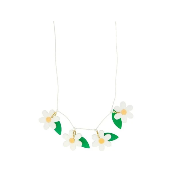 Meri Meri: Daisy Necklace. This delightful daisy necklace is a fabulous way to give any outfit a springtime look. It’s perfect to wear to parties, or whenever you want a touch of floral beauty. It makes a wonderful gift for those who love statement accessories. The daisies and leaves are crafted from white, yellow and green acrylic, which are attached with gold tone rings The necklace is made from white cord and a gold tone metal chain The length of the necklace is extendable, from 50-55cm, for versatility Easily close and open it with with the gold tone lobster clasp It features a small brass plaque with Meri Meri etched on it Suitable for ages 8+ Packaging made using eco-friendly paper Product dimensions:Total drop – 292mm See the whole Meri Meri collection here.