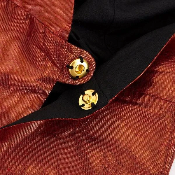 Little dino lovers will adore this Dinosaur Dress Up set! It makes a fantastic gift and and an excellent addition to a dress up box. The hooded jacket is crafted from red and copper lame. It has felt facial details and spikes sewn on the back. Perfect for lots of roaring good fun! The hooded cape is crafted from red and copper lame, and lined with black polycotton Embellished with black felt nostrils and eyes, and white felt teeth It has fabulous blue cotton spikes sewn on the back for a dramatic effect It has a silver snap fastener sewn onto the center tab Suitable for ages 3-6 years Product dimensions: Neck – 495mm, Length – 813mm Pack dimension: 292 x 25 x 406mm