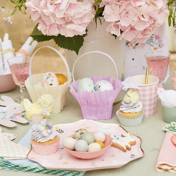 Make your Easter egg hunt even more special with these charming baskets. They are crafted from crepe paper in 6 fabulous colours, with ruffle detail for a stylish effect. The baskets are made from card with a crepe paper ruffle going around the outside Each set has 6 different coloured baskets- green, lilac, pale yellow, peach, blue and pink The handles tilt and slide into the baskets, ideal for making them easier to store when not in use Packaging made using eco-friendly paper Pack of 6 in 6 colours Product dimensions: 102 x 171 x 102mm