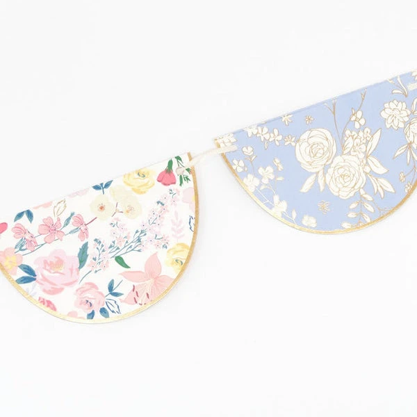 This elegant English Garden Scallop garland will look truly beautiful at any party, or for decorating your home with. Featuring sixteen floral pennants, pre-strung on ivory ribbon, with gold foil detail. 16 floral pennants Pre-strung on ivory ribbon Gold foil detail Made from eco-friendly paper Product dimensions:Garland length – 2.3m Measures 3.5m including excess cord