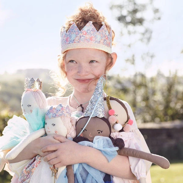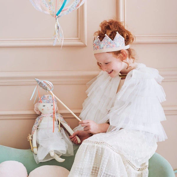 This gorgeous floral and pearl party crown will make any child look regal! A perfect addition to any dress-up box, and a fabulous gift to give and receive. Crafted from Liberty fabric with imitation pearl beads sewn onto each point of the crown. Features a peach velvet elastic ribbon band, with a velcro fastener. Padded floral fabric with pearl detail Peach velvet glitter elastic with hook & loop fastener Made with Liberty fabric Suitable for ages 3+ Product dimensions: 533 x 89mm SKU: 201805