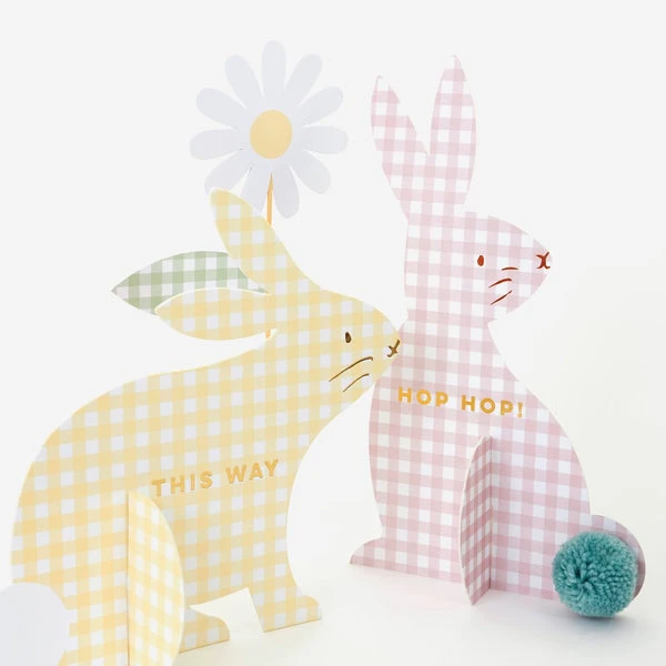 This egg hunt kit looks amazing with the gingham print detail. It features bunnies, daisies and signs with clues, with gold foil detail. A fabulous way to decorate your garden and give the kids lots of fun. The bunnies look adorable with pompom tails in coordinating colours Wooden skewers are attached to the signs for you to easily place them in the ground Gold foil clues are printed on the bunnies, like “This way” and “Over here” Simple self assembly required Made from eco-friendly paper Pack dimensions: 302 x 391 x 44mm SKU: 218755