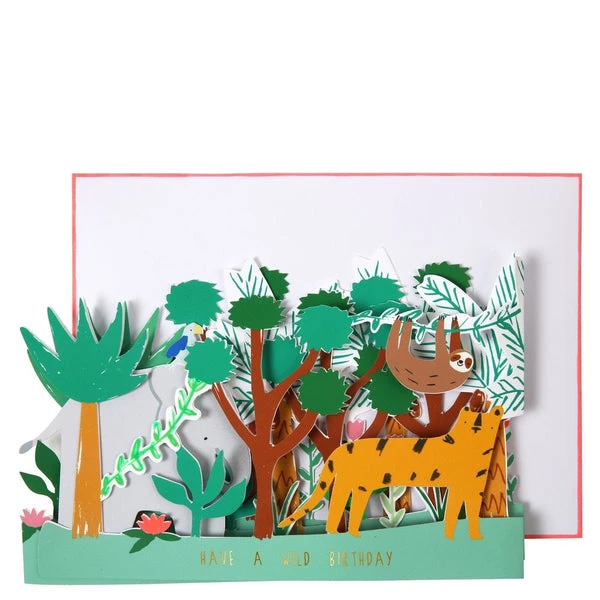 Cette belle carte lumineuse ne manquera pas d’égayer le jour spécial de quelqu’un. Elle s’ouvre pour former une scène de jungle debout remplie d’habitants colorés. Livrée avec une enveloppe coordonnée. Détail en feuille d’or Enveloppe blanche avec bord néon Message intérieur : Have a Wild Birthday Dimensions du produit : 178 x 127 mm . SKU: 159589