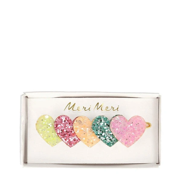 Give your hairstyle a loving touch with this gorgeous glittery fabric heart hair clip! Perfect for Valentine’s Day, or to wear at any special occasion. A really lovely gift to give or receive! Glitter fabric hearts Gold tone snap clip Suitable for ages 4+ Box dimensions: 3.25 x 1.875 x 0.5 inches SKU: 199509