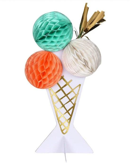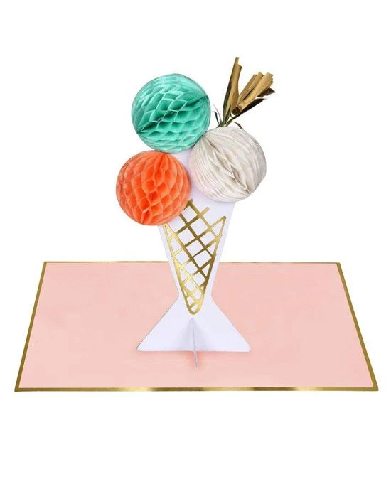 Give a friend a birthday treat with this delightful ice cream card. Beautifully crafted with coloured honeycomb paper, gold strips and shiny gold foil embellishments. Comes with a coordinating envelope. Honeycomb with gold tassel Gold foil detail Pink envelope with gold foil edge Inside Message: Happy Birthday Product dimensions: 178 x 127mm