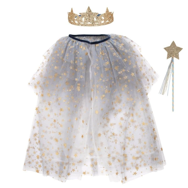 Let your kids shine like a star in this sensational costume. It’s perfect for parties, plays, or dress up at home. It features a tulle cape, a star crown and a star wand. A wonderful gift for hours of imaginative play. The cape is crafted from layers of pale blue tulle, with gold glitter star detail, a blue velvet trim and and closes with a press stud The crown has a blue velvet headband, and gold glitter fabric stars backed with felt The wand is adorned with blue and gold ribbons, and topped with a gold glitter fabric star Suitable for ages 3-6 years Product dimensions:Neck – 457mm, Length – 711mm SKU: 217108