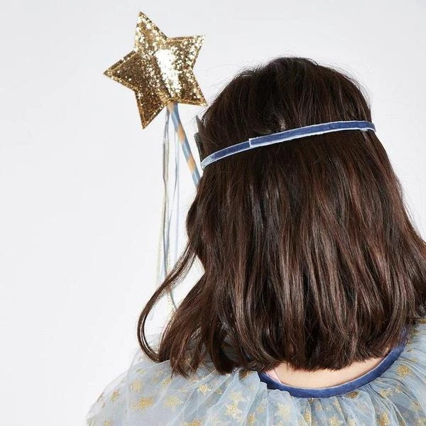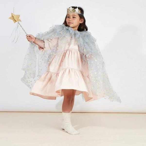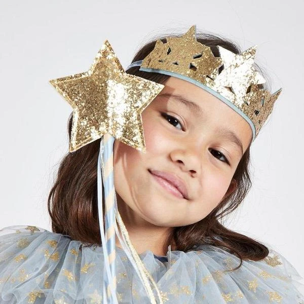 Let your kids shine like a star in this sensational costume. It’s perfect for parties, plays, or dress up at home. It features a tulle cape, a star crown and a star wand. A wonderful gift for hours of imaginative play. The cape is crafted from layers of pale blue tulle, with gold glitter star detail, a blue velvet trim and and closes with a press stud The crown has a blue velvet headband, and gold glitter fabric stars backed with felt The wand is adorned with blue and gold ribbons, and topped with a gold glitter fabric star Suitable for ages 3-6 years Product dimensions: Neck – 457mm, Length – 711mm SKU: 217108