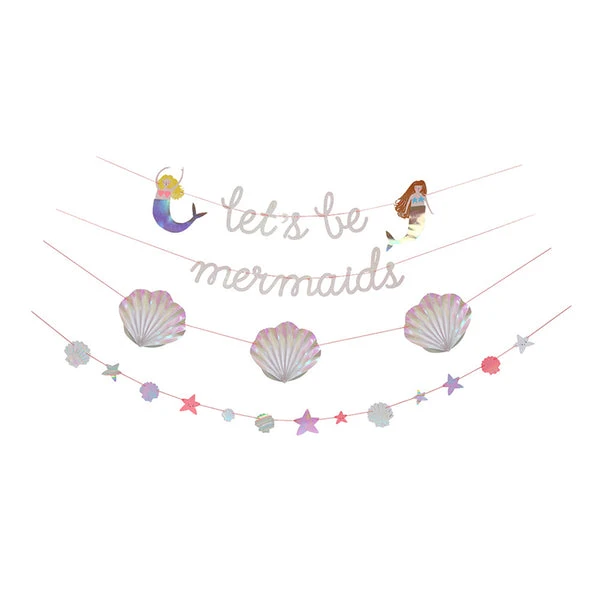Create an undersea world with this beautiful mermaid garland featuring a let’s be mermaids slogan and a pair of mermaids with shimmering, holographic foil tails. There are also scollop shell pennants and an array of glittering stars. Pack contains 1 garland. Garland length: 32 feet. Pack size: 17 x 6 x 1 inches. New Part Number: 156052