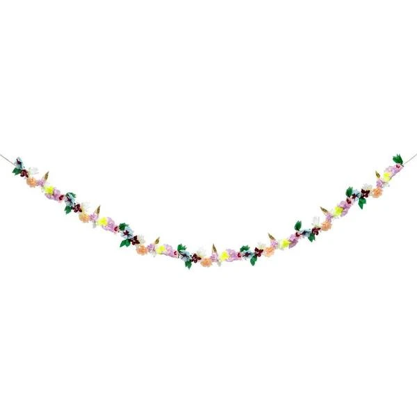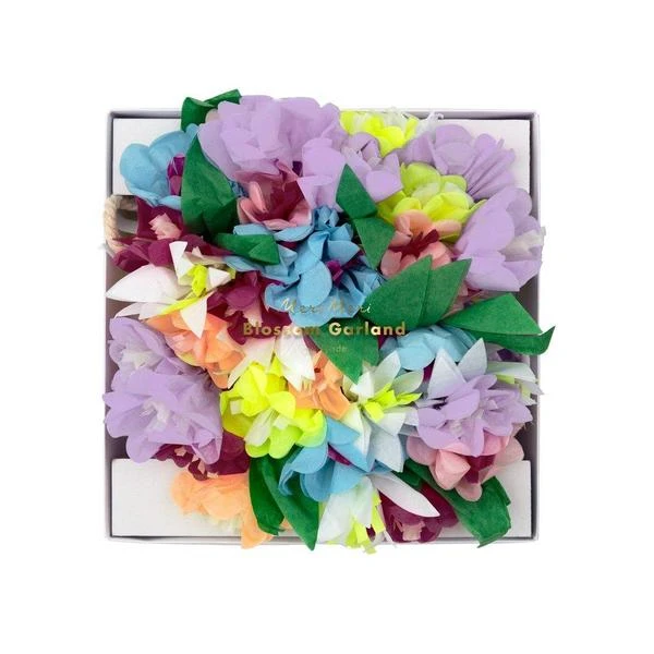 Meri Meri: Lilac blossom garland. Bring the beauty of nature into your home with this gorgeous garland. Featuring assorted bright and beautiful flower and leaf pennants crafted from pastel and neon tissue with stylish gold foil detail. 78 assorted flower & leaf pennants Pre-strung on braided string Neon & pastel tissue Gold foil detail Product length: 3.5m