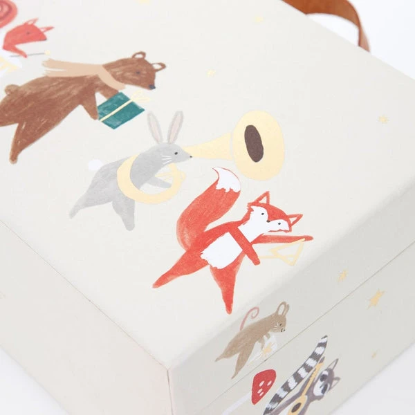 Animal, and music lovers, will adore this very special advent calendar in a suitcase. Open it to reveal the numbered letter trays, in which are etched wooden animals, all playing instruments or holding gifts, and an etched wooden Christmas tree. It’s perfect for imaginative play during the festive season and all year. The suitcase can be used to store the animals, and other toys, in for fun on the go. The suitcase features a delightful design of a marching animal band, with gold foil detail Hold the suitcase with the stylish leather handle, and open and close it with the burnished brass closure Open the gold foil numbered trays inside to reveal the etched animal and Christmas tree pieces The animals slot into special pieces, included, for them to stand upright Suitable for ages 8+ Made from eco-friendly paper Pack dimensions: 229 x 152 x 102mm SKU: 216928