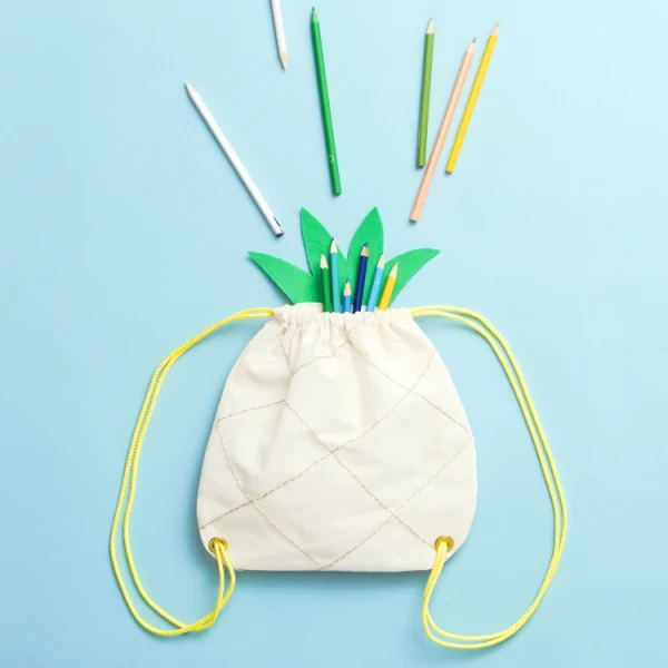 Cool backpack shaped like pineapple with decorative embroidery in gold and shoulder straps in neon yellow.