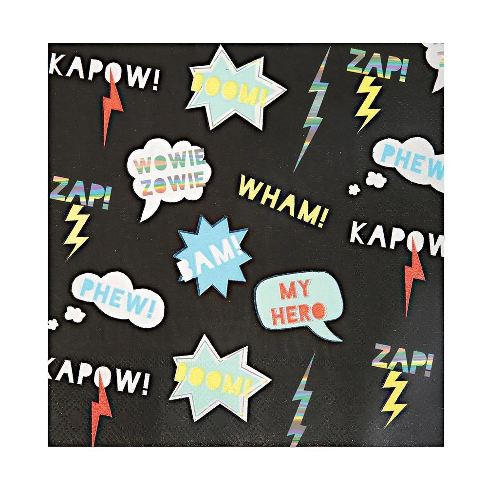 These cool paper napkins are perfect for superheroes to use. Decorated with cartoon patterns embellished with shiny holographic silver foil.
