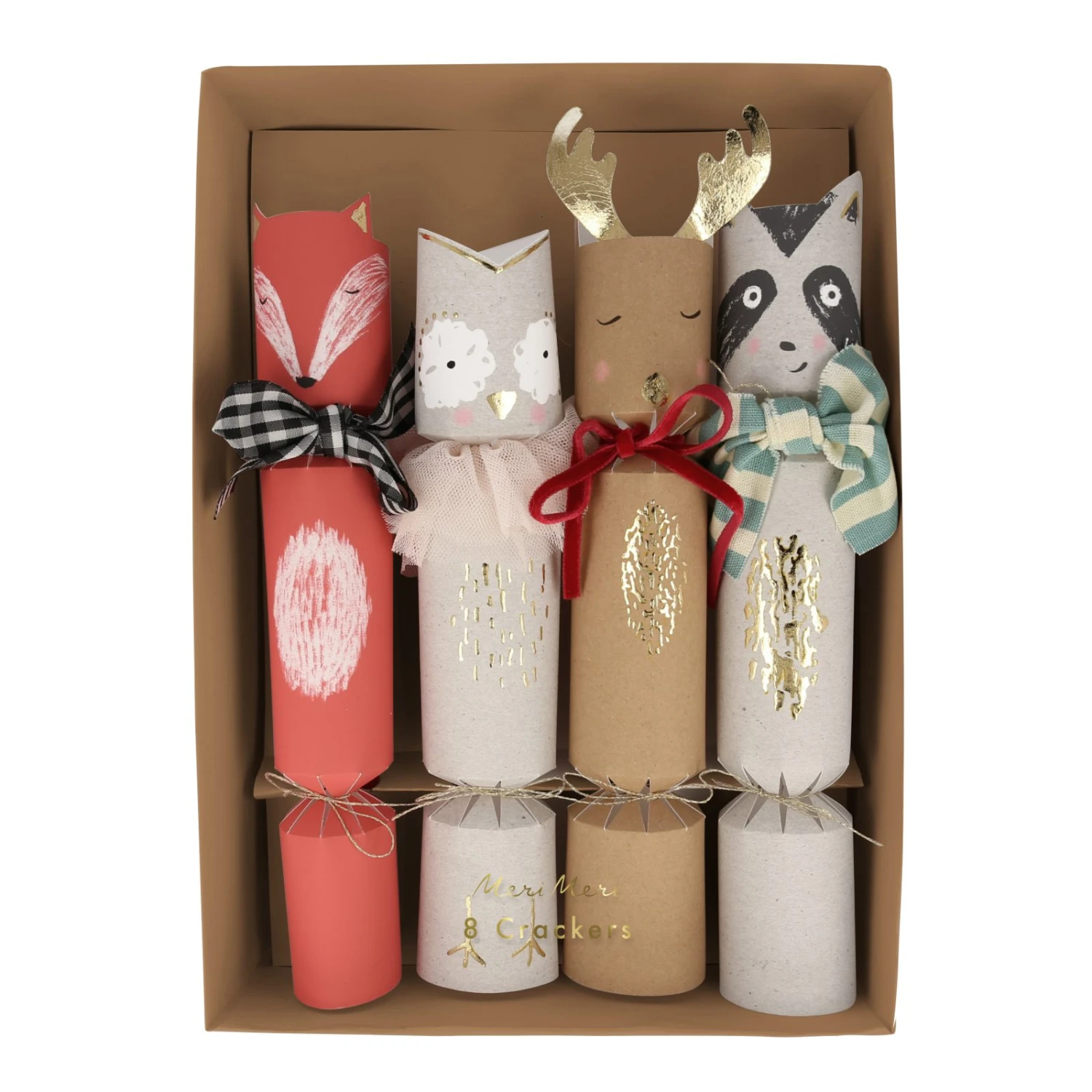 The crackers are crafted from high-quality art and kraft paper. The animals feature scarf embellishments are made from ribbons and tulle, and gold foil detail.