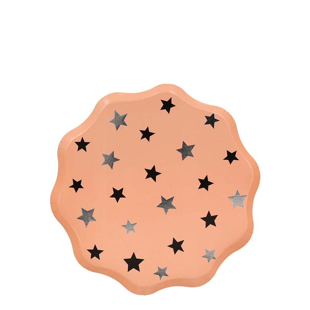 These pastel peach plates, covered with shimmering silver stars, will add a stylish touch to your Halloween party table. They have a beautiful scalloped edge border, which your party guests will be sure to be impressed by. The plates have shiny silver foil star detail. They have a scalloped edge border design. Pack of 8 plates.