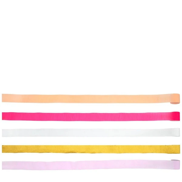 These pretty pink streamers will add a beautiful touch of color to the party room. Perfect for a fairy or magical princess party, baby shower or any romantic celebration. Neon & gold detail of 5 in 5 colours Product dimensions: Streamer length – 838mm SKU: 202956