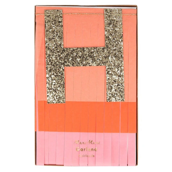 This beautiful Happy birthday garland is the perfect decoration to let the special birthday girl or boy know you care! It features pretty pink, peach and coral fringed tissue paper and glittered letters. The fringed pennants are made of pink, peach and coral tissue paper The two layers of tissue paper are folded together before being cut into fringing The glittered letters are pre-threaded onto cord, and the fringing is stitched together with peach satin ribbons Packaging made using eco-friendly paper Eco-friendly glitter Product dimensions:Garland length – 0.9m Measures 2.4m including excess cord