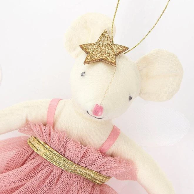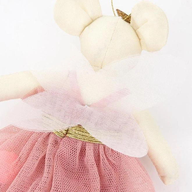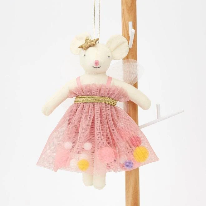 Kids Christmas tree decoration by Meri Meri. This pretty pink fairy mouse will add an adorable touch to your festive decorations. She is crafted from cotton, with a colourful pompom dress and white organdie wings. Details: – She is crafted from cotton with sweet embroidered features- Her dress is made with pink tulle, with a fabric lining, and gold elastic trim- The dress has fun pompom embellishments in bright shades- She has stiff white organdie wings- She is accessorised with a chunky gold glitter fabric star- There is a shiny gold cord to hang her up with Product dimensions: 108 x 146 x 38mm
