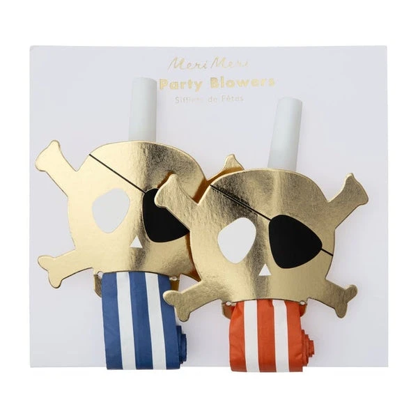 Little pirates will just love these fun skull party blowers. Perfect to put on the table or place in party bags. Gold foil detail Pack of 4 in 2 colours Pack dimensions: 152 x 133 x 25mm SKU: 186604