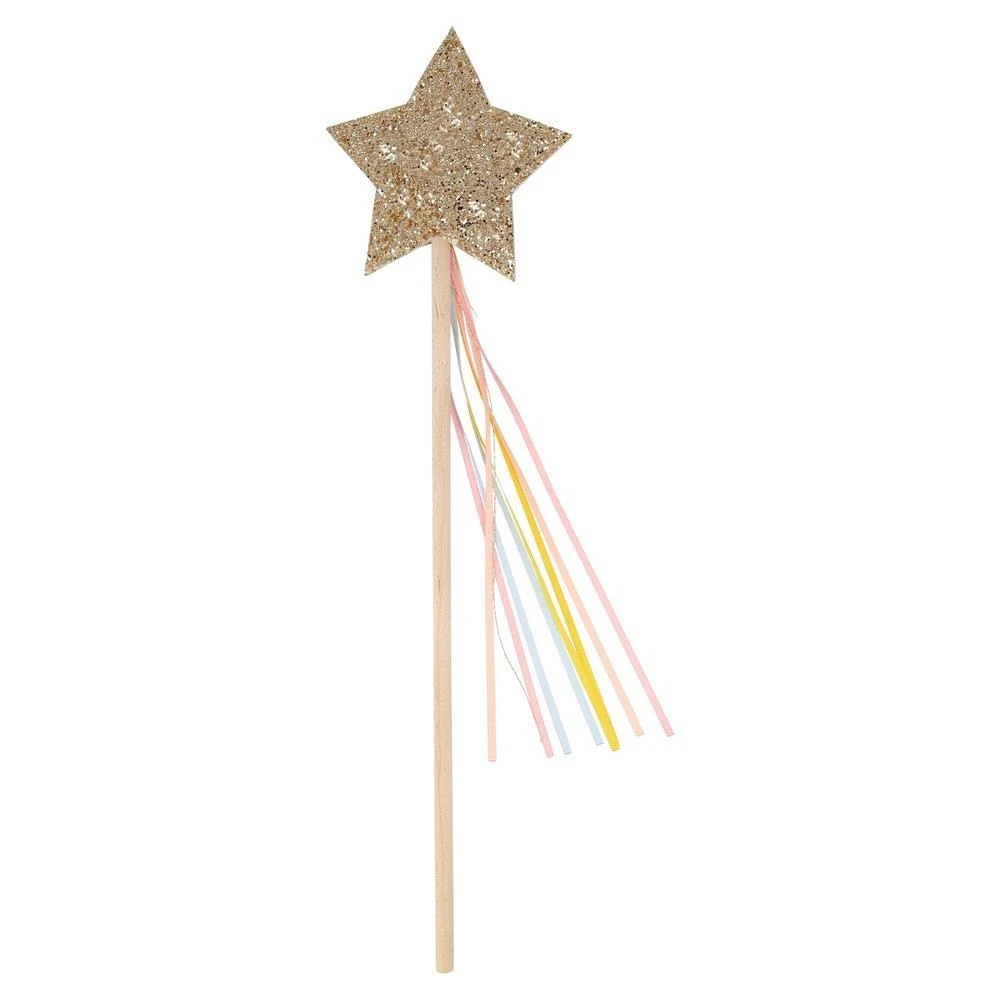 The star wand features chunky gold glitter and 4 ribbons for a special touch