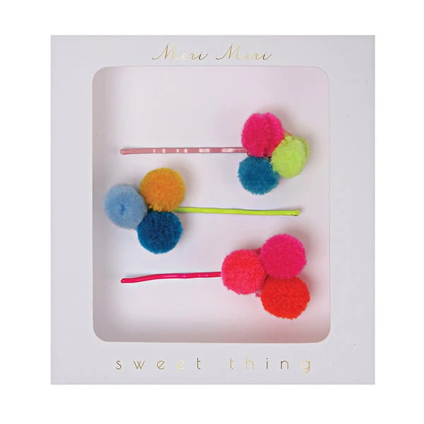 Decorate your hair with these colored pins with neon pom-poms. Each pin has an arrangement of 3 pom-poms co-ordinated in different colors. Pack contains 3 hair pins. Pack size: 4 x 4 inches. New Part Number: 144568