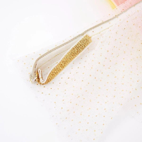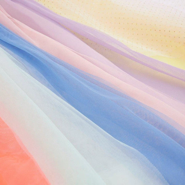 This gorgeous rainbow dress-up kit is perfect for a little one to transform into a beautiful fairy. The dress is made from layers of colourful tulle, for a spectacular effect, and has a polycotton lining. It has floaty layered tulle wings attached, with a glittery gold border. Comes with a wand, with a happy sun face, to cast magical spells. The lined tulle dress has bright segment overlays for a remarkable rainbow effect It has adjustable arm straps and delightful detachable wings The set includes a gorgeous glitter fabric sun wand, for casting happy spells Product dimensions: (3-4 years)Length – 737mm SKU: 188980