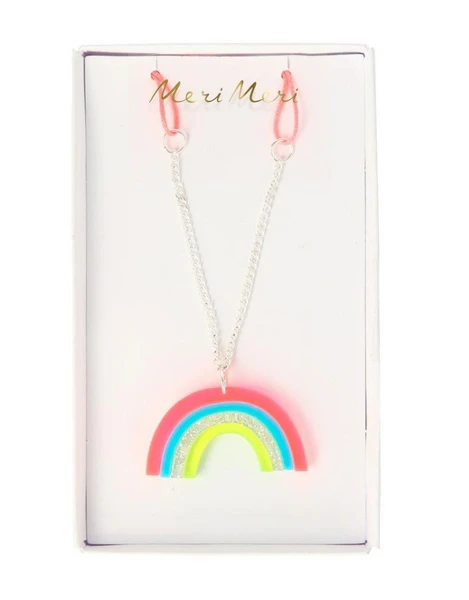 Wish you could see a beautiful rainbow every day? Well now you can this amazing necklace, a bright glittery rainbow crafted from acrylic, hung on a silver tone chain that has an adjustable cord to lengthen shorten.