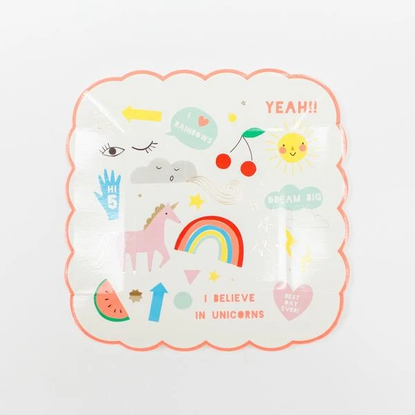 Pack of 8 plates 165mm x 165 mm Rainbow and Unicorn paper plates By Meri Meri will make any party table magical. foil detail.