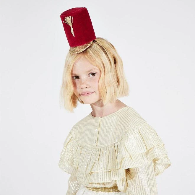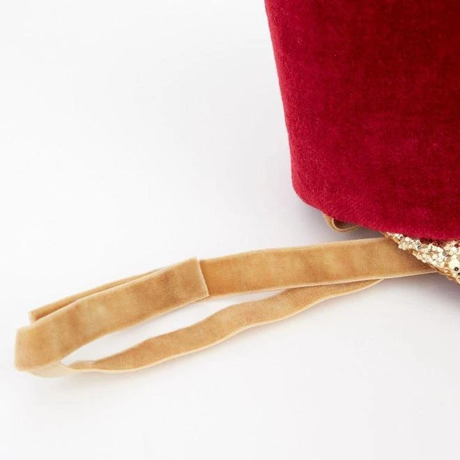 This Nutcracker style soldier hat is the perfect accessory for a festive party, or for dress up fun any time of the year. It is crafted from red velvet with stylish gold details.
