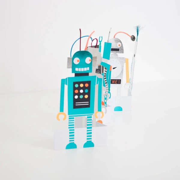 Round cord embellishments in metallic pink, metallic silver, blue and neon coral Metallic blue tassel embellishment Co-ordinating envelope Shiny silver and blue foil details Message: Happy Birthday (on insert) Made from eco-friendly paper Product dimensions: 546 x 175mm This fabulous robot card opens up to reveal six shiny robots. They all feature sensational embellishments, making this a delightful decoration to display not just for the special day but all year.