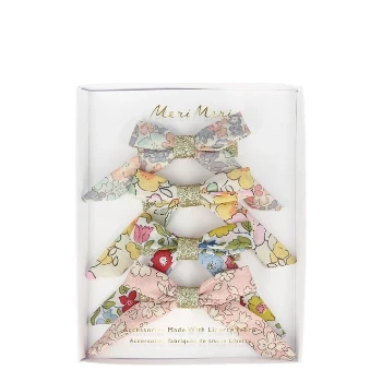 Bows are a charming hair accessory and these are even more delightful as they’re made with a gorgeous Liberty floral fabric, with glimmering glitter gold fabric detail. Wear the set of four all at once for a statement look, or mix and match according to your outfit or mood!