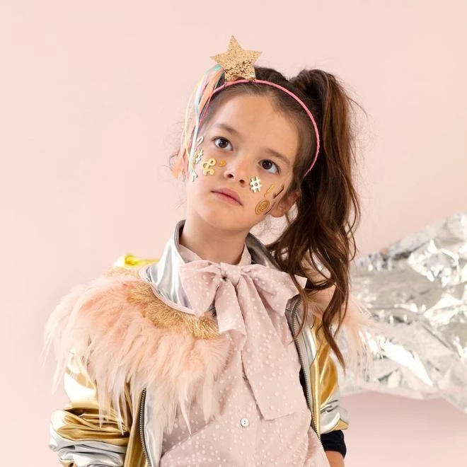 Be the star of any party or celebration with this sensational headband. The metal headband is wrapped in pink ribbon, and is topped with a gold star. The star has a bright tail crafted from ribbons and cord, which will swish as you move around. Details: – The metal headband is wrapped in pink grosgrain ribbon – The star is crafted from chunky gold glitter fabric, on the front and back – There is a beautiful tail on the star made from ribbons, in pink, mint, yellow, blue and neon, and cord, in pink, teal and gold Recommended Age: +3 years Product dimensions: 146 x 184 x 6mm