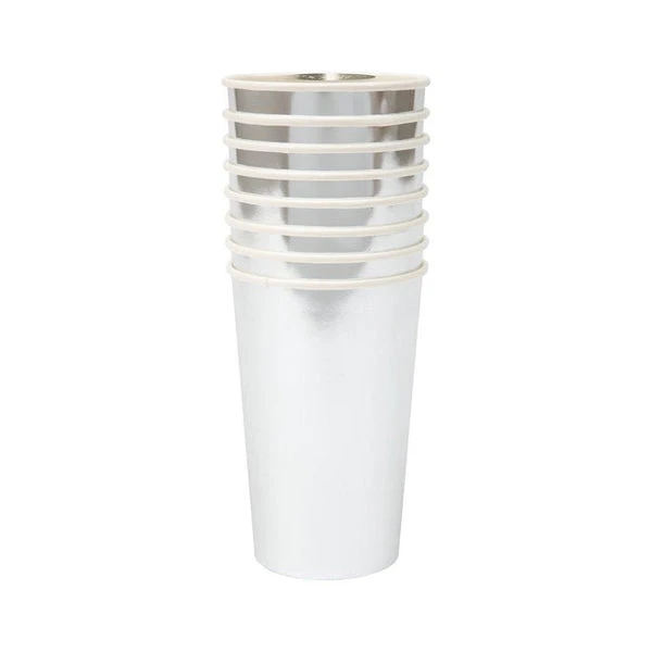 Serve delicious drinks in these stylish silver highball cups to impress your guests. Made from high-quality card with a superb gloss finish. Pack of 8 cups Suitable for hot & cold drinks Silver foil detail Capacity: 369 ml Product dimensions: 86 x 130 x 86 mm