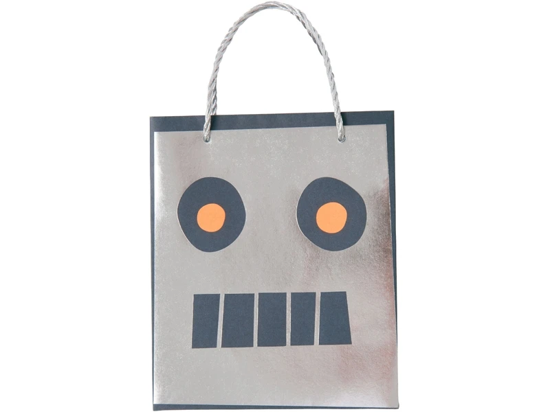 Meri Meri Party Gift Bags SPACE ROBOT. Don’t let your young astronauts leave your party without a bag of super-goodies. These cool robot party bags are crafted in shiny silver paper and finished with metallic string handles. Pack contains 8 party bags. Size: 15,5 x 12,5 x 4,5 cm.