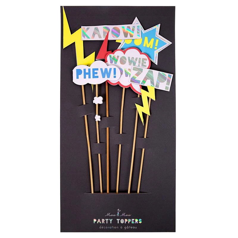 Decorate your cakes in superhero style with these amazing party toppers, each with a cartoon flag in bright colors and with shiny holographic silver foil embellishments. Pack contains 6 party toppers. Pack size: 7 x 14 inches.