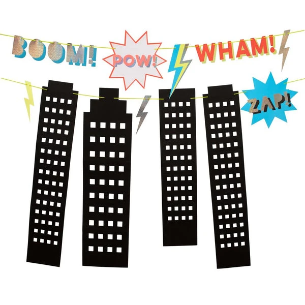 If you’re looking for a garland that really makes a statement, then you’ll love this! The attention to detail, bright colours and fun statements “Boom!, Pow, Wham! and Zap!”, will delight your party guests. 2 Pre-strung garlands Neon yellow cord for hanging Sparkly silver holographic foil details Made from eco-friendly paper Product dimensions:Garland length – 1.5m Measures 2.7m including excess cord Pack dimensions: 305 x 448 x 6mm