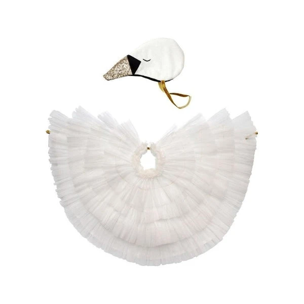 Meri Meri – Swan Cape Dress Up. This delightful dress-up kit will instantly transform your little one into a beautiful swan. Featuring delicate tulle wings and a headpiece crafted from soft velvet, cotton and glittery fabric with embroidered details. Gorgeous!White lined layered tulle winged cape with white velvet headdressGold glitter elastic & hook and loop fastenersStitched features with glitter fabric detailHanger for displaySuitable for ages 3-6 yearsSee the whole Meri Meri collection here.
