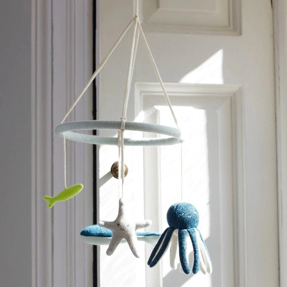 Add a touch of underwater beauty to a little one’s room with this gorgeous mobile. Featuring beautifully crafted sea creatures, made from organic knitted cotton with shimmering thread detail. Knitted organic cotton 4 themed pennants on wrapped bamboo ring Neon & silver thread detail Suitable for ages 0-6 months Product dimensions: 114 x 864mm