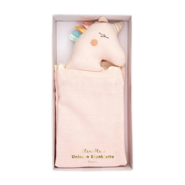 Made from soft 100% cotton, with sweet embroidered features, this unicorn blanklette is a magical gift for a little one to snuggle. Comes with a coordinating drawstring bag. Natural cotton Satin edge with padded head and knot feet Stitched features Gold thread detail Suitable for ages 0-6 months Product dimensions: 406 x 457mm SKU: 187387