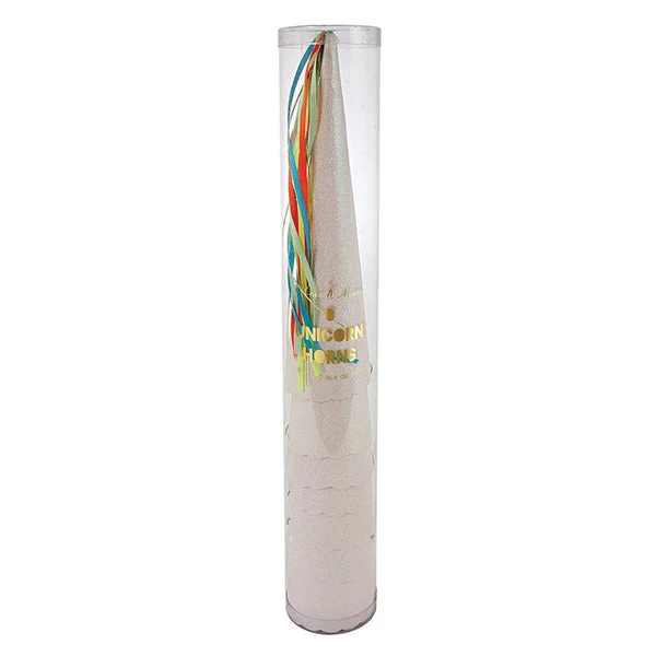 Wow your guests with these fabulous unicorn horn party hats. Each one is beautifully crafted from sparkly glitter paper and embellished with a coloured ribbon. Each hat is topped with neon & gold ribbon tassels Crystal glitter detail adds a stylish shine Pack of 8 Product dimensions: 51 x 216mm