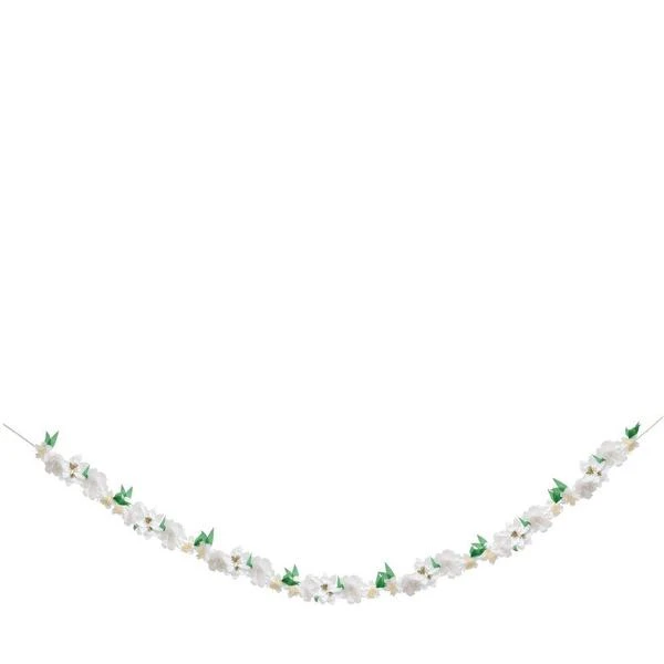 Meri Meri: White blossom garland. Bring the beauty of summer into your home with this gorgeous white blossom garland. The flowers and leaves are crafted from paper then hand-assembled on to a natural cotton rope. 45 assorted tissue flower & leaf pennants Pre-strung on natural cotton rope Gold foil detail Product length: 3.5m