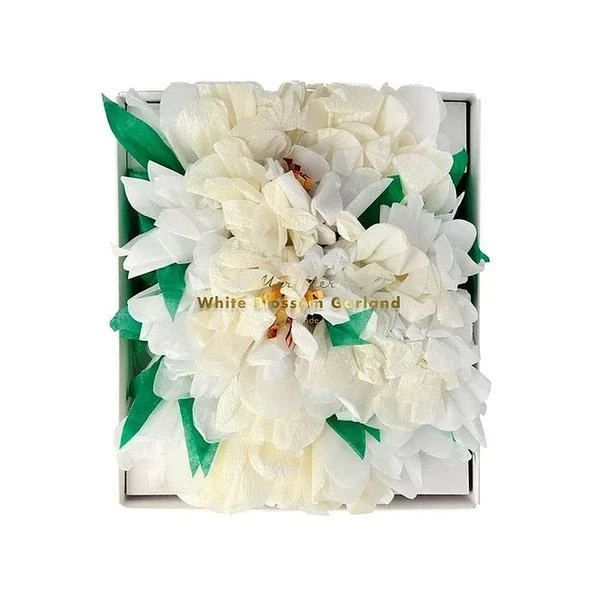 Lovely white blossom garland with flowers and leaves crafted from paper then hand-assembled on to a natural cotton rope. 45 assorted tissue flower & leaf pennants Pre-strung on natural cotton rope Gold foil detail Product dimensions: Garland Length – 2.3m Measures 3.5m including excess cord
